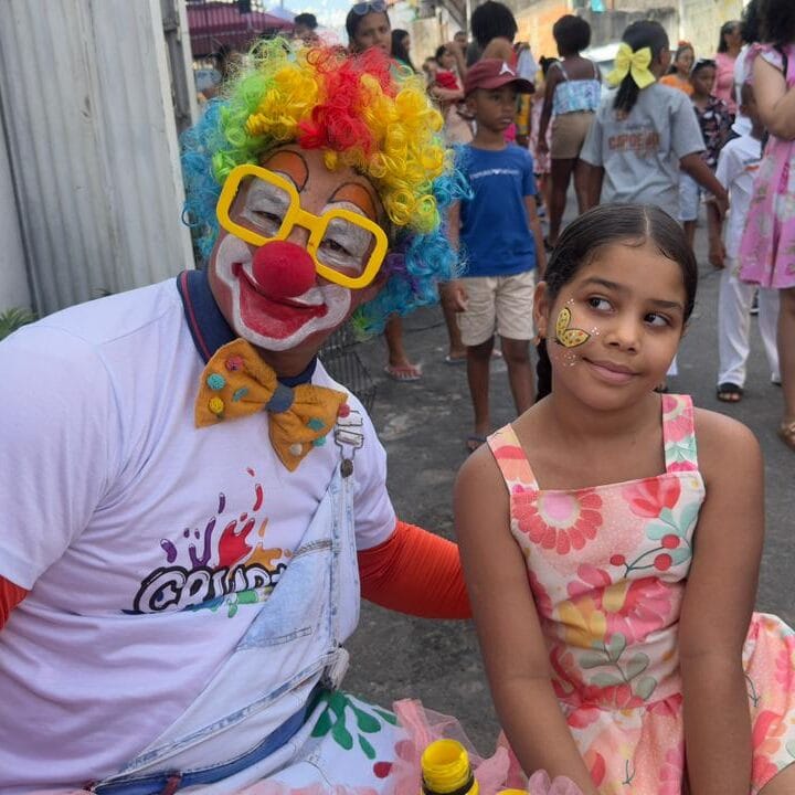 Entre os destaques da tarde, o palhaço Pirulito encantou as crianças com pinturas faciais e brincadeiras. A pequena Júlia, de 8 anos, não conteve a empolgação: